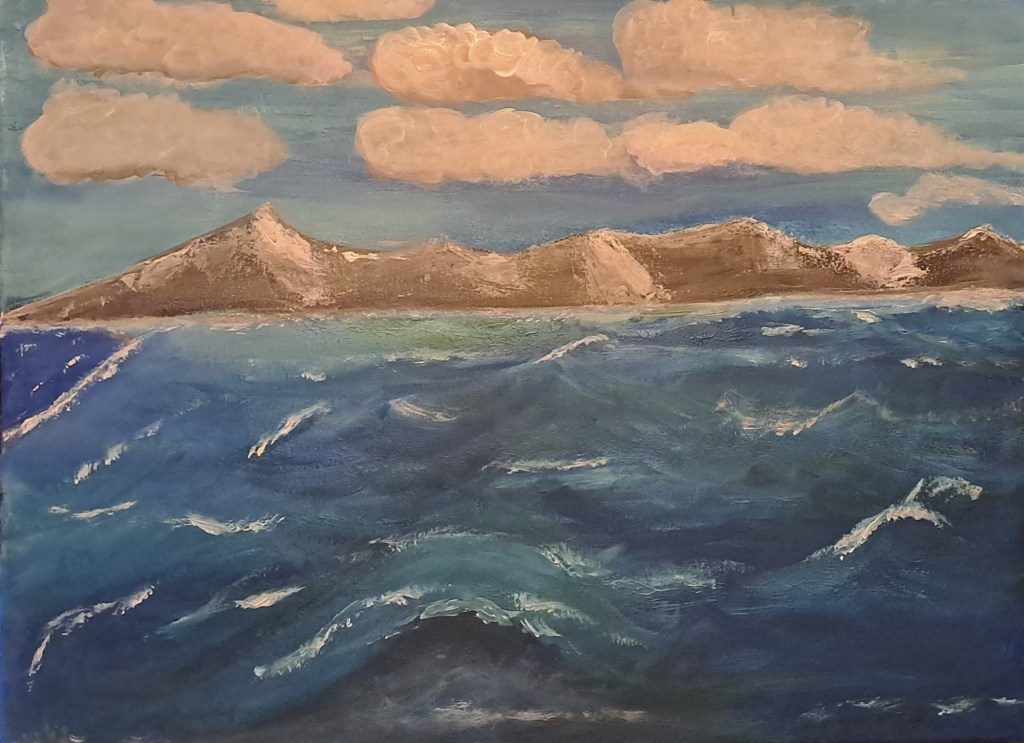 “Stormy Waters” by Laura Bernardeschi Nelson (2025) beautifully captures the raw power and danger of nature in a seascape, where the forces of the weather and landscape converge. The piece depicts a tumultuous scene possibly viewed from a boat or ship in the midst of a storm, surrounded by cold, imposing mountains blanketed in snow.
