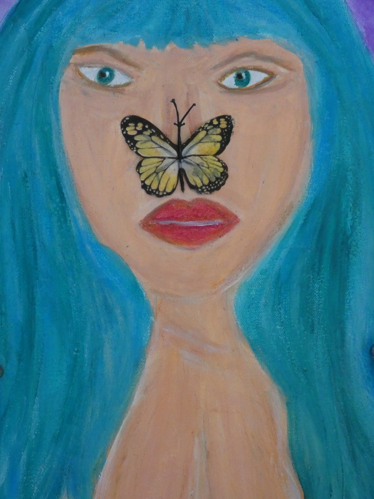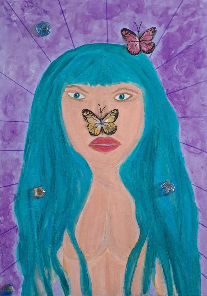 Adding to the richness of this portrayal is the delicate presence of two butterflies perched gently on her form. Butterflies, long symbols of transformation, rebirth, and freedom, further deepen the artwork’s narrative. Their inclusion suggests that the girl is not only an embodiment of nature but also a catalyst for its ongoing evolution. Just as the butterfly emerges from its cocoon into new life, the girl seems to represent nature’s perpetual cycle of growth, renewal, and change. She actively nurtures and supports the natural world around her, allowing it to flourish and transform.