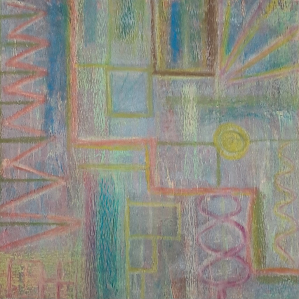 This abstract artwork by Laura B. Nelson, measuring 40×40 cm and created using mixed media on canvas, features a composition rich in geometric shapes, soft color transitions, and layered textures. The interplay of pastel hues—blues, greens, yellows, and pinks—creates a dreamlike effect, while the structured elements such as rectangles, zigzags, and circular forms introduce an architectural and rhythmic quality.