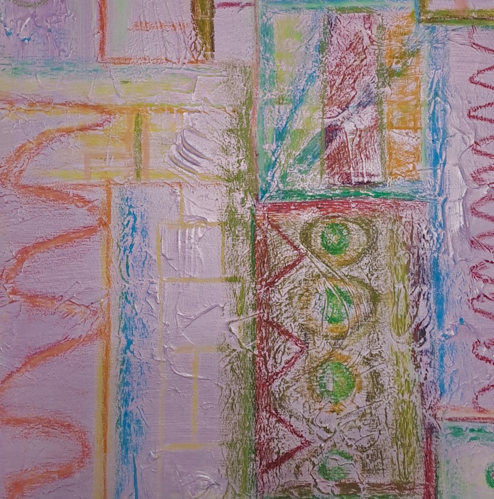 The pastel colours represent a soft, hopeful outlook despite the underlying rough textures, which suggest struggles, resilience, and the imperfections of social structures. The scattered circular motifs with red centres symbolise individuals within a system—each unique yet interconnected. Meanwhile, the zigzag lines and irregular shapes represent the tensions, negotiations, and fluidity of human relationships, highlighting both harmony and conflict.