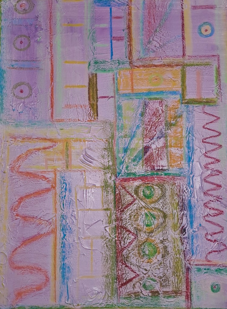 This abstract painting features a textured surface with a pastel colour palette dominated by shades of lilac, soft pink, light blue, and warm yellow. The composition consists of geometric shapes, layered rectangles, and lines intersecting across the canvas. Some sections have a more structured grid-like appearance, while others incorporate organic, free-flowing forms.