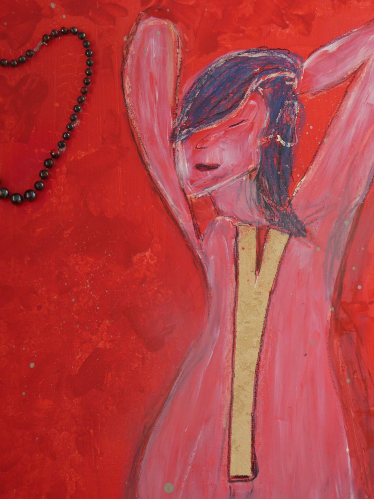 Using acrylic, oil pastels, and spray chalk paint on her old kitchen hardboard, Laura Bernardeschi Nelson created this piece of art, which depicts a woman in an expressive and emotionally charged manner. The figure is painted in shades of pink and red, blending into a richly textured red background that evokes warmth and intensity.