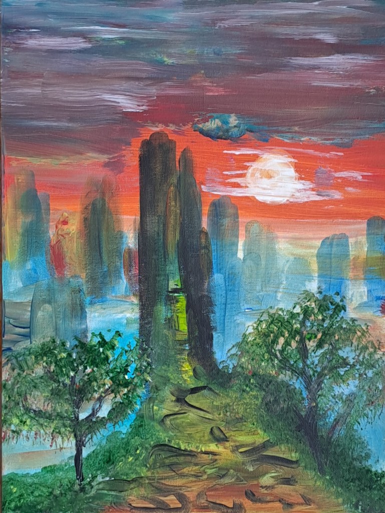 Above, the sky is a striking contrast of dark, polluted gray, but it’s softened by a powerful sunset. The traditional hues of orange, purple, and yellow bleed across the sky, reminiscent of nature’s original colours. The sunset, though slightly obscured by the remnants of smog, symbolizes a new beginning, where the natural beauty of the earth can once again shine through. The whole scene evokes a sense of quiet optimism, a hopeful message of nature’s resilience and the possibility of a harmonious future.