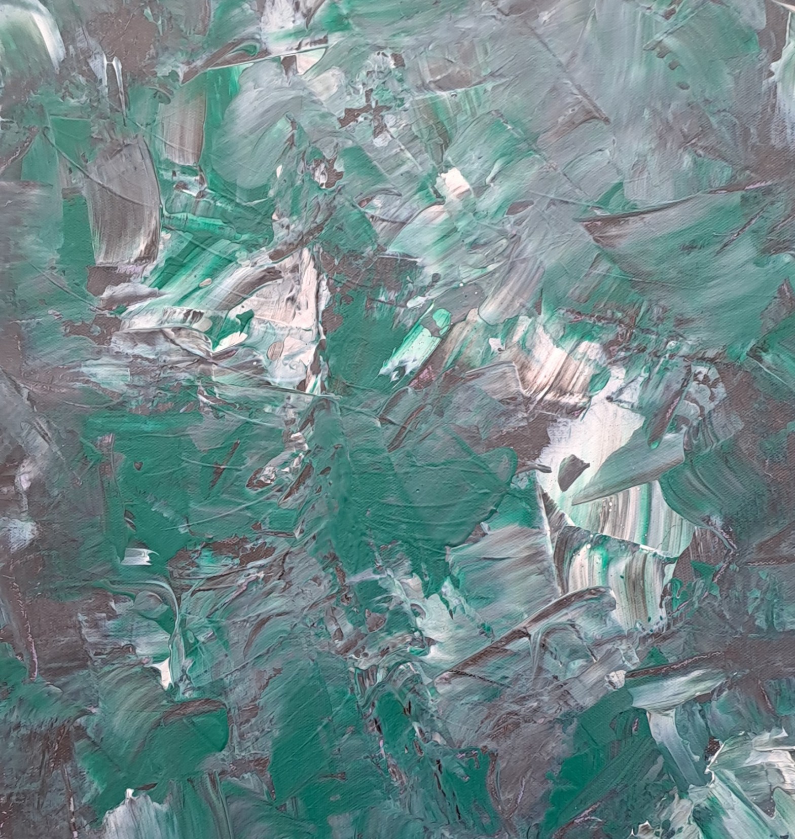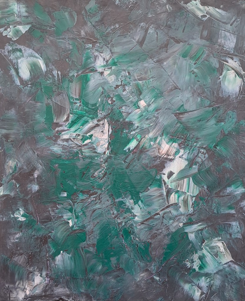 The result is a surface that feels both organic and intentional, with areas of turbulence balanced by calm, misty passages. The use of cool tones—emerald greens, greys, and whites—lends the painting a meditative, atmospheric quality. There is no fixed focal point; instead, the eye is encouraged to move across the canvas, discovering rhythms and echoes throughout.