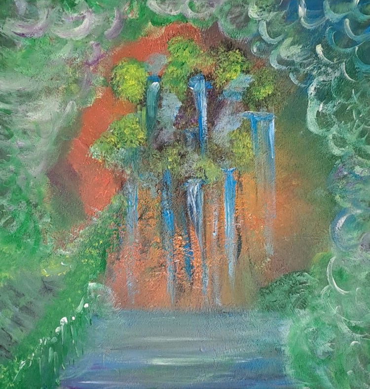 In this dreamlike acrylic composition, Laura Bernardeschi Nelson invites us into a world suspended between reality and reverie—a fantastical vision rising from the sea like a prophecy. Rendered with textured brushwork and ethereal colour layering, the painting suggests a mythical rebirth: an island of untouched nature ascending from tranquil waters, crowned with lush trees and cascading waterfalls that shimmer with the blue of purity and renewal.
