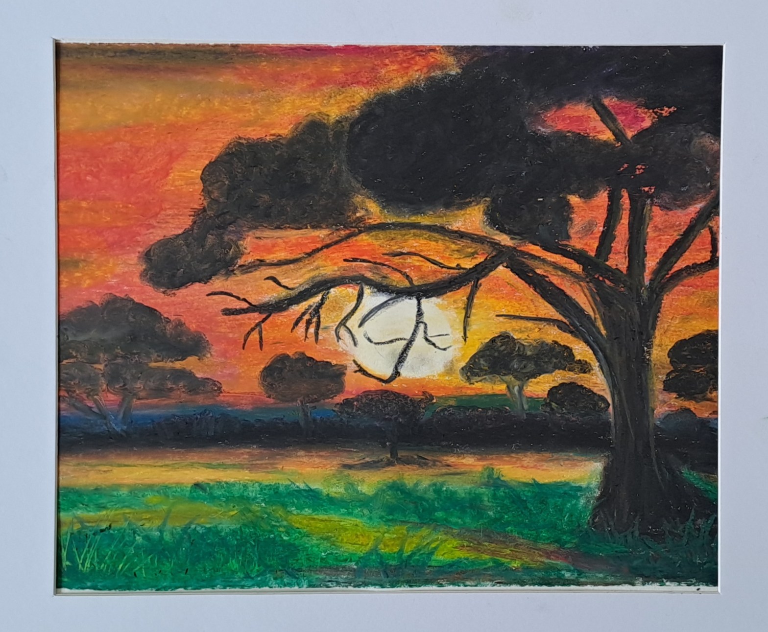 Branches of Firelight by Laura Bernardeschi Nelson captures a fleeting moment between dusk and dark, where the silhouettes of trees stand stark against a sky ablaze with sunset hues. Rendered in lush oil pastels, this original landscape evokes the warmth and stillness of twilight. The large central tree, with its reaching limbs, frames a glowing full moon suspended in a tangle of branches, lending a sense of mystery and quiet symbolism to the scene. Bold textural contrasts and dynamic layering bring the sky to life with fiery reds and deep oranges, grounded by the cool greens of the earth below.