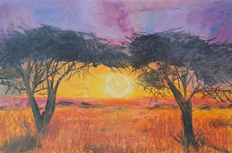 This piece is not merely a landscape, but a pause in time — a moment when the world holds its breath. The oil pastels, layered with tenderness and texture, give body to the warmth in the air, the rustle of dry leaves, the stillness that only dusk brings. The trees, dark and sheltering, frame the sun like guardians of an ancient secret, and in their embrace, the light seems to pulse with quiet reverence.