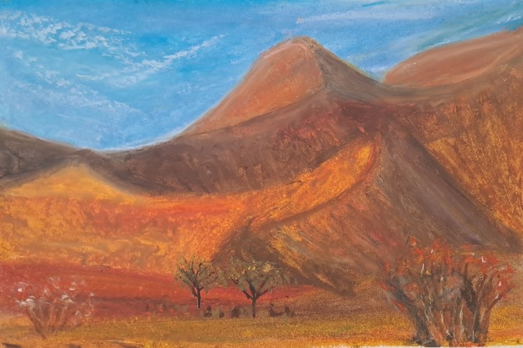 This desert does not speak loudly. It hums in rust and gold, in the warm breath of sienna winds and the lingering touch of ochre sun. Craggy slopes rise like ancient sentinels beneath a sky brushed in twilight’s blue, while low trees and brittle brush stretch toward the quiet. Here, stillness is not empty — it is full of memory, of passage, of light just barely letting go.