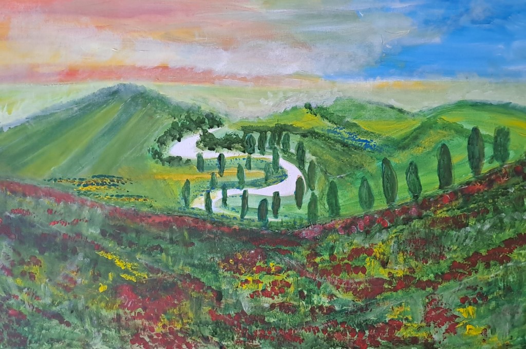 A vivid journey through memory and emotion, Fields of Light is an original landscape painting by Laura Bernardeschi Nelson that celebrates the radiant harmony of the Tuscan countryside. Executed in richly acrylics colours , this work presents a winding, dreamlike road that curves gently through verdant hills, lined with rhythmic cypress trees like sentinels of time.