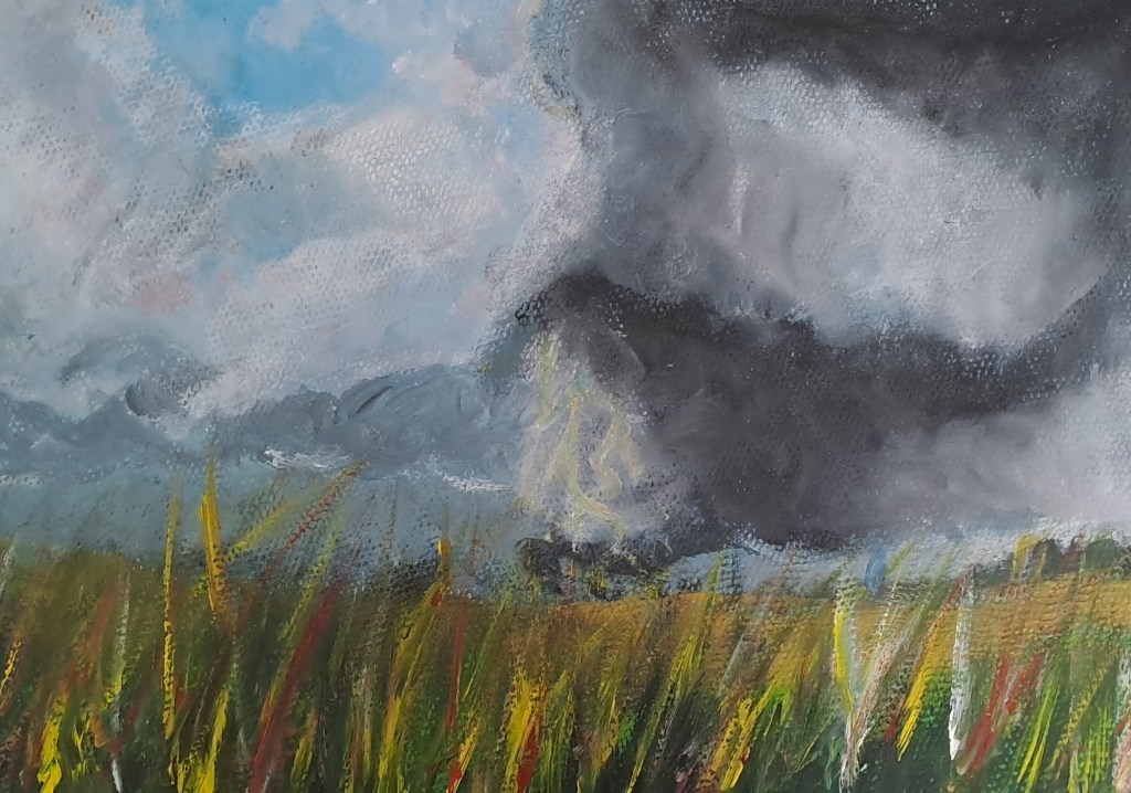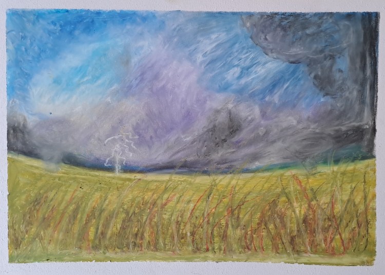 Using only oil pastels, the artist brings texture and movement to every part of the scene, from the restless grass in the foreground to the turbulent sky above. A sliver of light breaks through the storm, adding a breath of hope and balance to the composition.