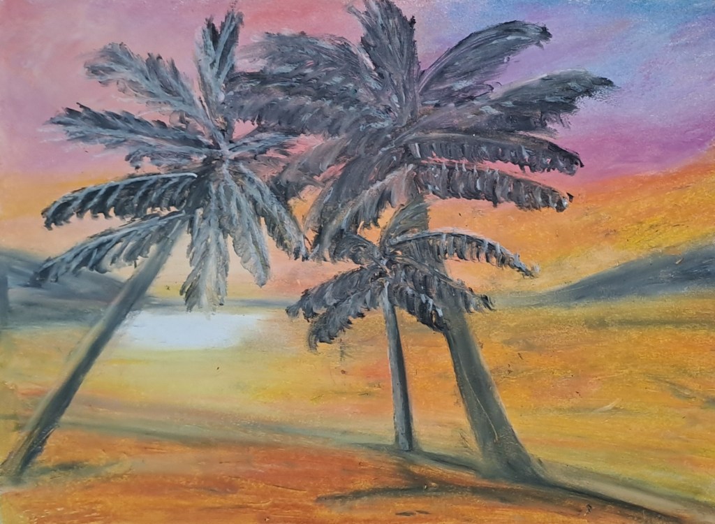 The composition invites the viewer into a moment suspended in light and memory—a place of peace, movement, and tropical grace. The soft layering and blending of oil pastels create a velvety texture, bringing life to the trees and sky while retaining a dreamlike atmosphere.