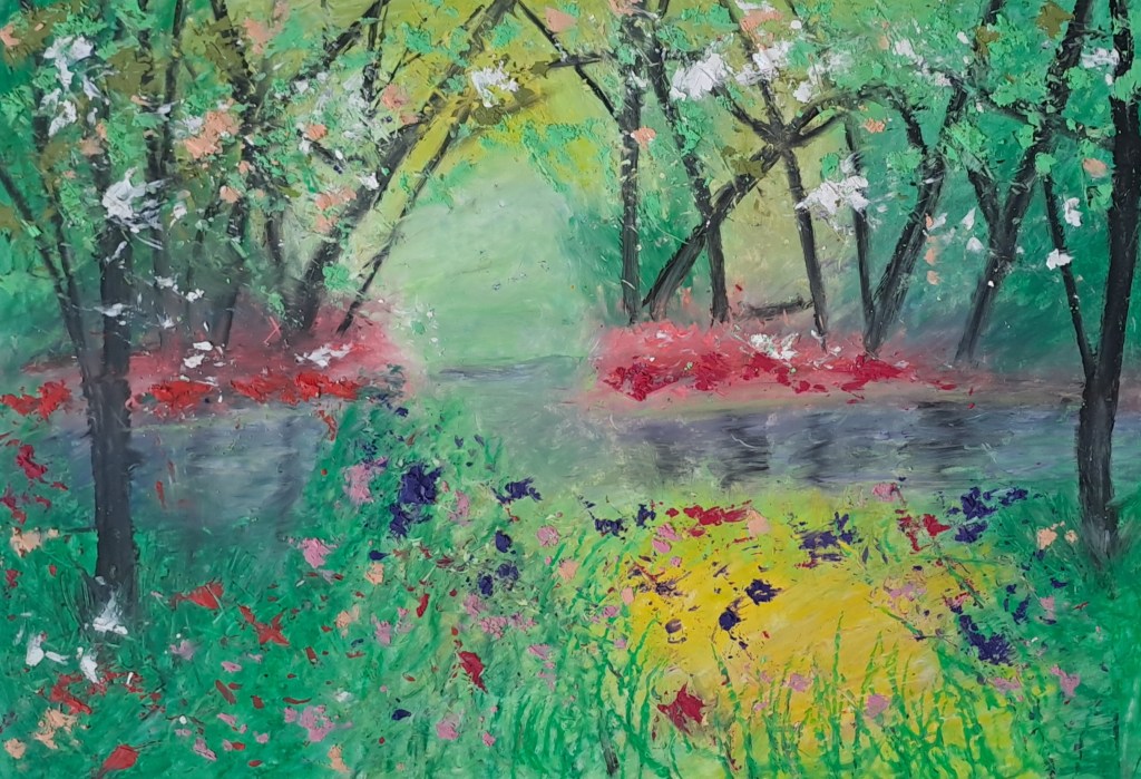 Created using oil pastels applied with both fingers and palette knives, the work layers rough impasto against soft blending, generating an immersive texture. The artist has allowed abstraction to brush against representation — flowers become color fields, trees dissolve into gesture, and water flickers between reflection and movement.