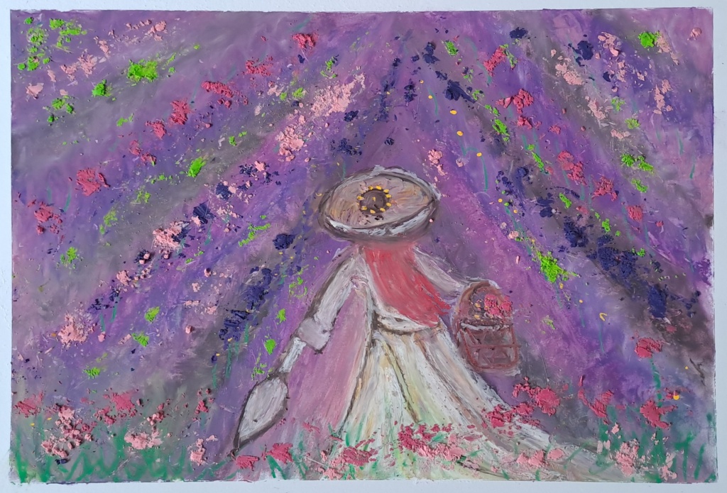 Philosophically, the work grapples with the theme of quiet stewardship—how we tend not only to gardens but to our inner lives. The lavender field is not just a place but a state of mind. The composition’s gentle movement from left to right, with diagonal light shafts drawing the eye upward, evokes a spiritual unfolding. It’s as though something is being gathered—perhaps not flowers, but moments, lessons, and fragments of memory.