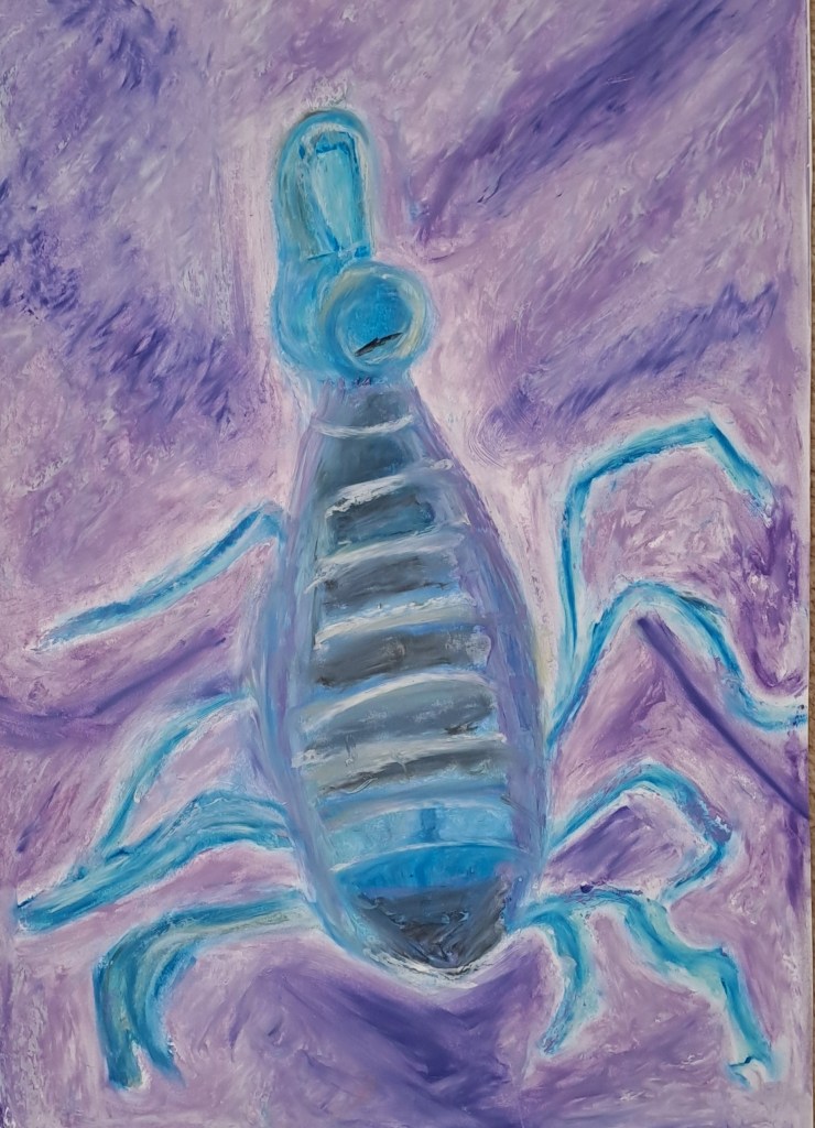 From a technical perspective, the artist’s use of layered color in the scorpion’s body, tail, and claws speaks to the natural layering seen in nature itself. The interplay of dark and light blues and teals creates a sense of texture and dimension, while the background, painted with softer strokes of purple, acts as a fluid, atmospheric space that contrasts yet complements the figure of the scorpion. The varnish applied to the surface enhances the vibrancy of the pastels, giving the piece a glossy finish that catches light and further accentuates its dynamic texture.