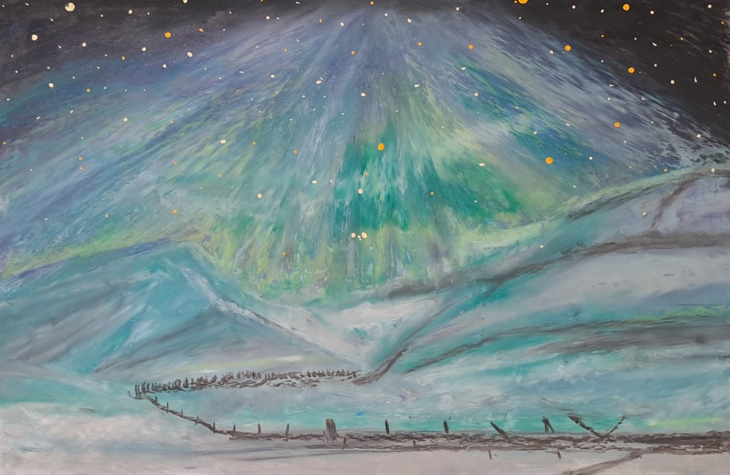 Where the Sky Begins to Sing is an original dreamscape by Laura Bernardeschi Nelson, created with oil pastels on paper and preserved with a protective varnish. Born from a vivid nocturnal vision, this artwork captures the quiet awe of witnessing the aurora borealis—where the earth feels hushed beneath a symphony of celestial light.