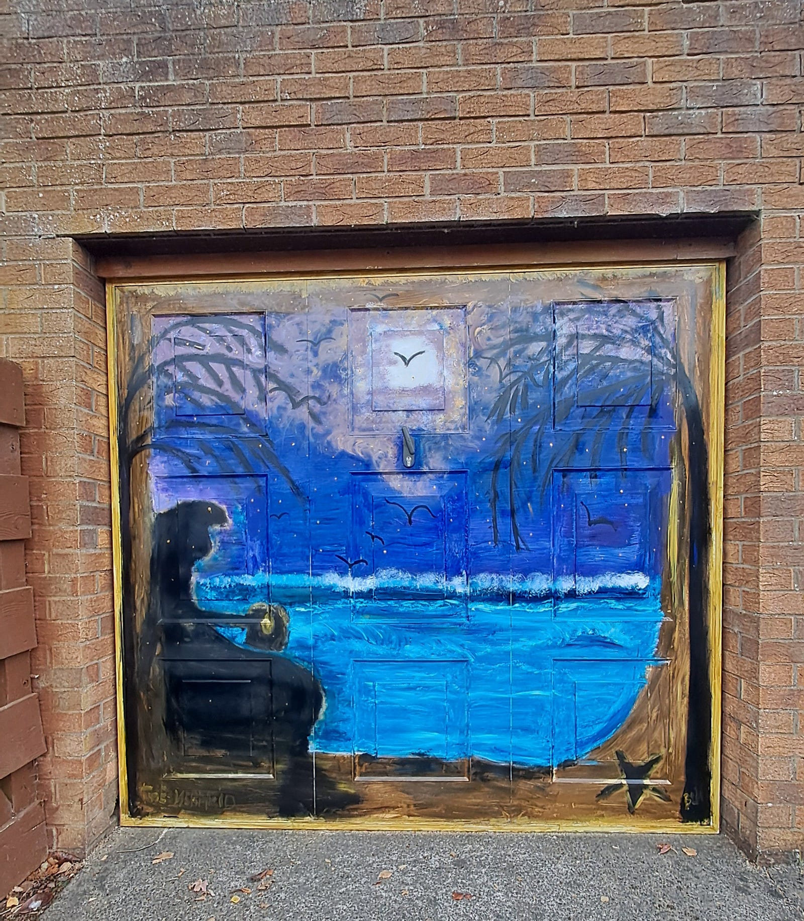 The mural is a solitary figure, seated and thoughtful, gazing out over a deep, dreamlike sea. The sky above is bruised with twilight blues, scattered with birds and illuminated by a watchful moon. The painting, done in acrylics and protected with varnish, is both an escape and a declaration.