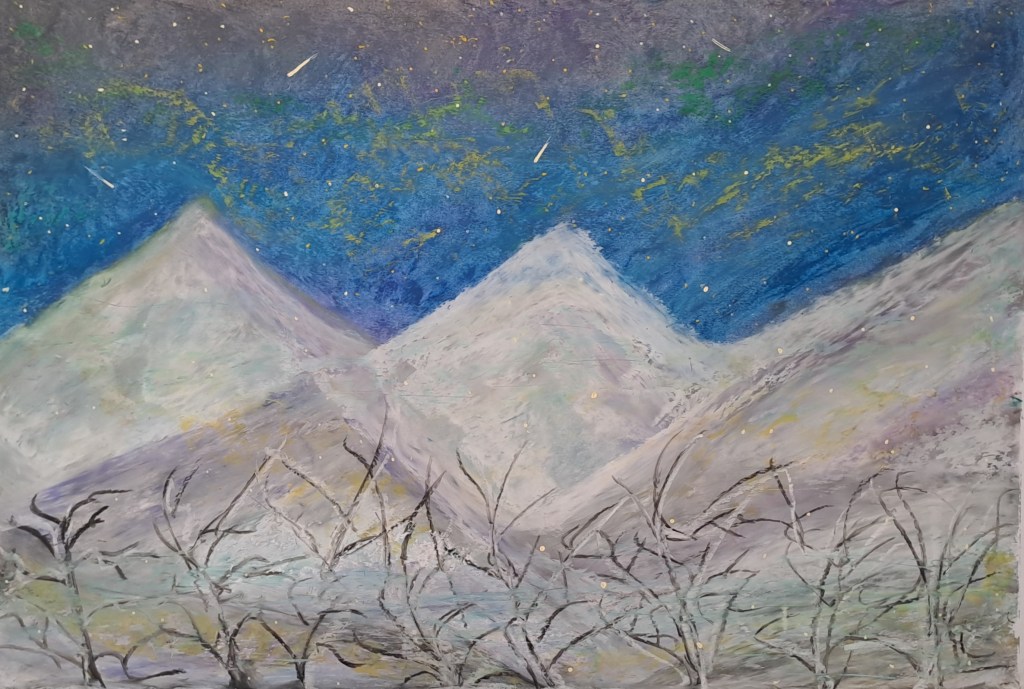 This expressive piece, created with oil pastels on fine art paper, portrays snow-covered peaks glowing softly under a deep star-filled sky. Streaks of light and subtle touches of green and gold illuminate the heavens, while bare winter trees stretch upward in quiet contrast. The artwork radiates both stillness and wonder, inviting the viewer to pause and breathe in the calm of nature’s vast beauty.