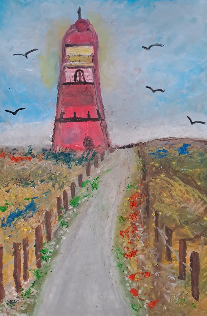 Created with richly layered oil pastels on quality paper, this vibrant painting captures a winding path leading to a striking red lighthouse standing tall under an open sky. Birds soar freely above, while colorful wildflowers line the path, adding life and movement to the composition. The textured strokes and bold contrasts evoke a sense of journey, hope, and adventure.