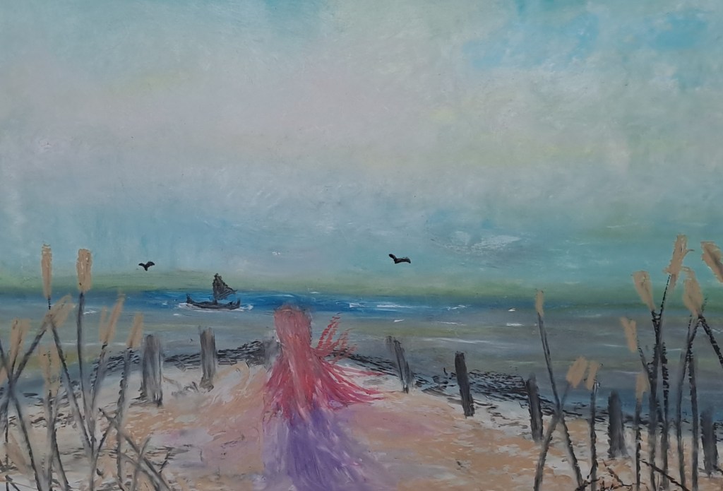 I created this work using oil pastels on paper (40 x 30 cm), a medium that allowed me to blend soft textures with vibrant emotion. The swirling sky, the shimmering sea, and the wind-blown grasses were all guided by the feeling of waiting — of loving someone not here, and perhaps not near, but always present in the heart.