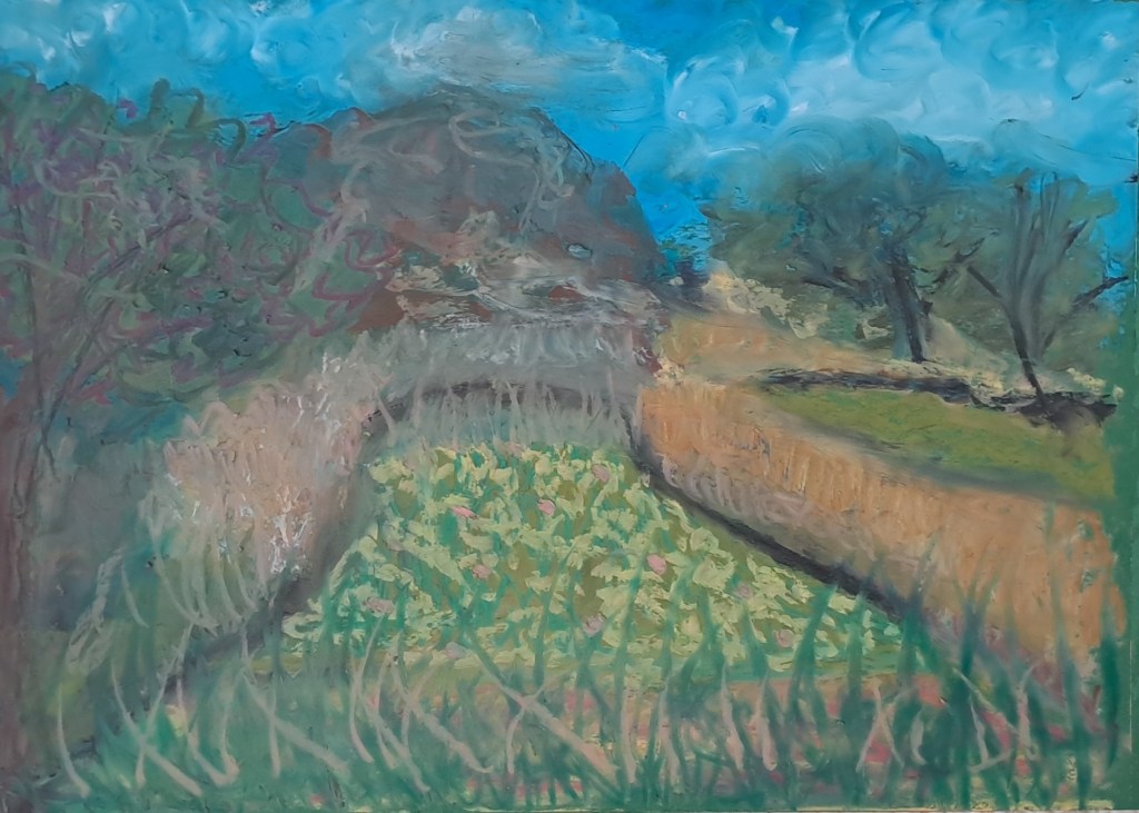 Working in oil pastels, the artist layers strokes of green, ochre, and violet against a luminous blue sky, creating a rhythm that feels alive and ever-changing. The scene belongs as much to memory and sensation as to place: a meadow that whispers of growth, transition, and timeless presence.