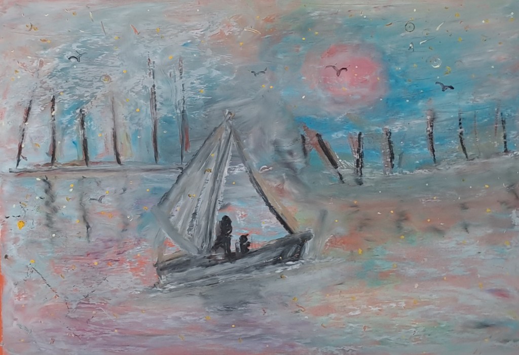 Laura Bernardeschi Nelson’s expressive use of oil pastels lends the piece its glowing textures and ethereal atmosphere. It is a painting that speaks to journeys both literal and symbolic: a passage through dusk, through silence, through the unknown.