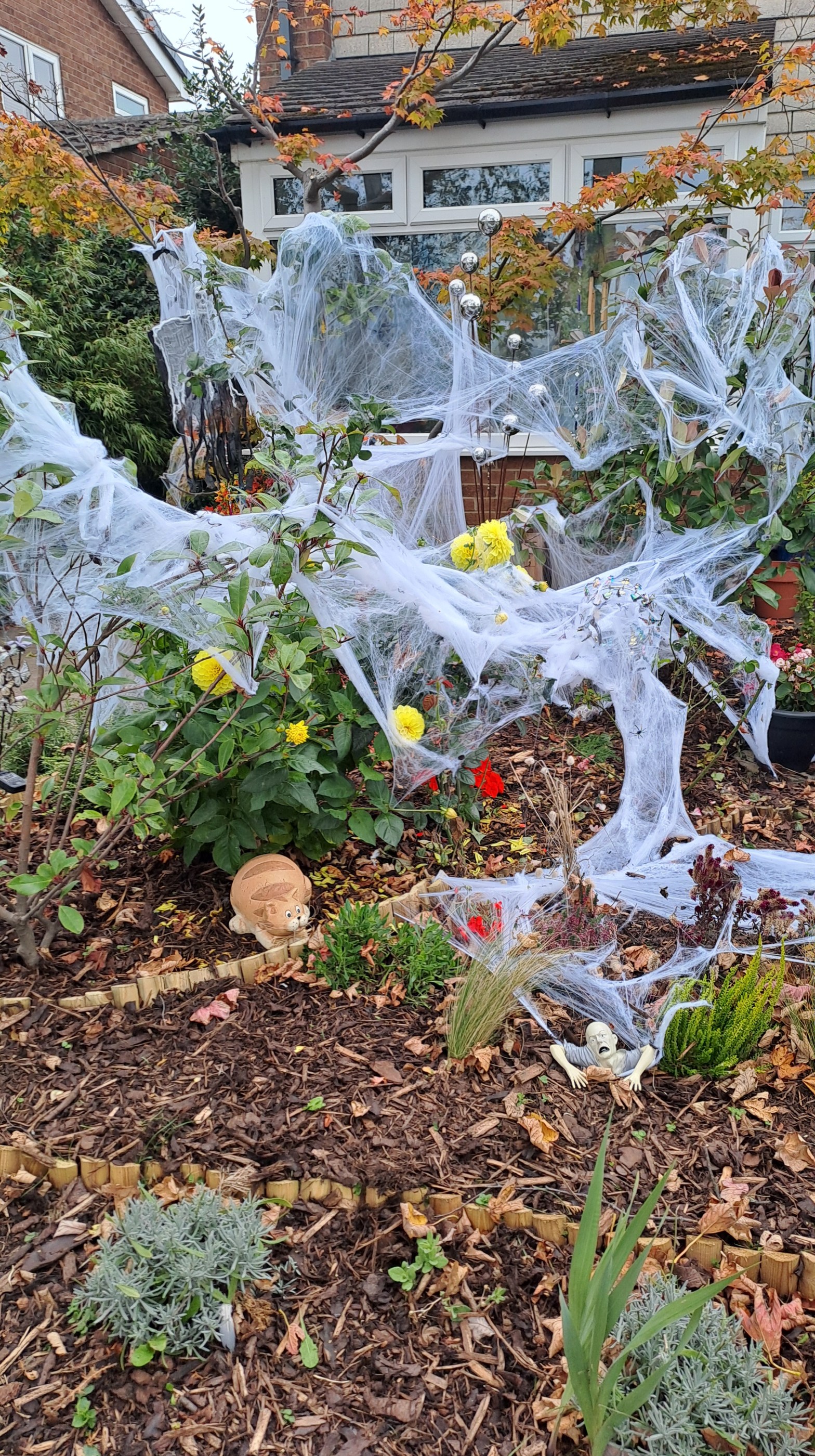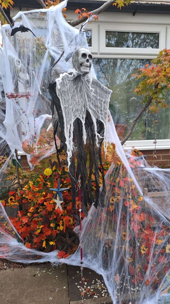 The enthusiasm for decorating here is amazing! Shops and websites are full of creative props—some spooky, some funny, some just beautiful. This year, I decided to use that inspiration for my own little art project in my front garden. I combined artificial spider webs, an old bicycle, silk flowers, and bright red leaves to make a one-of-a-kind Halloween scene. It’s been such a joy to watch people stop, smile, and take it all in.