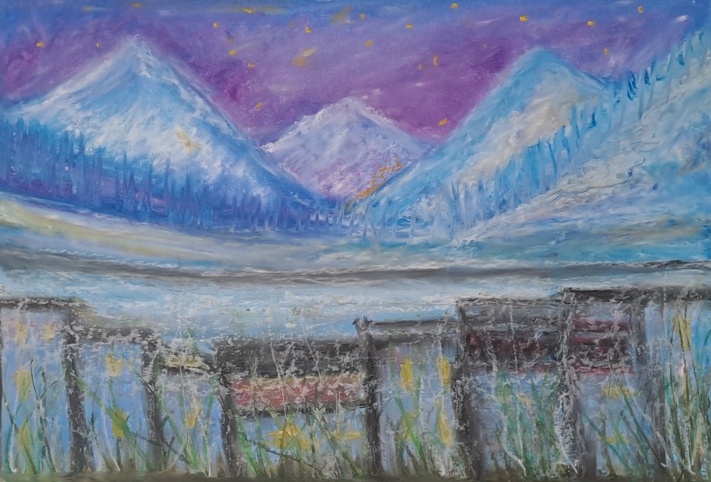 Thawing Boundaries evokes a landscape caught between winter’s stillness and the slow pulse of renewal. A fragile fence emerges from melting ground, its structure softened by time and shifting temperatures. Beyond it, snow-laden mountains and a violet sky shimmer in the light of change — a world both fading and reforming.