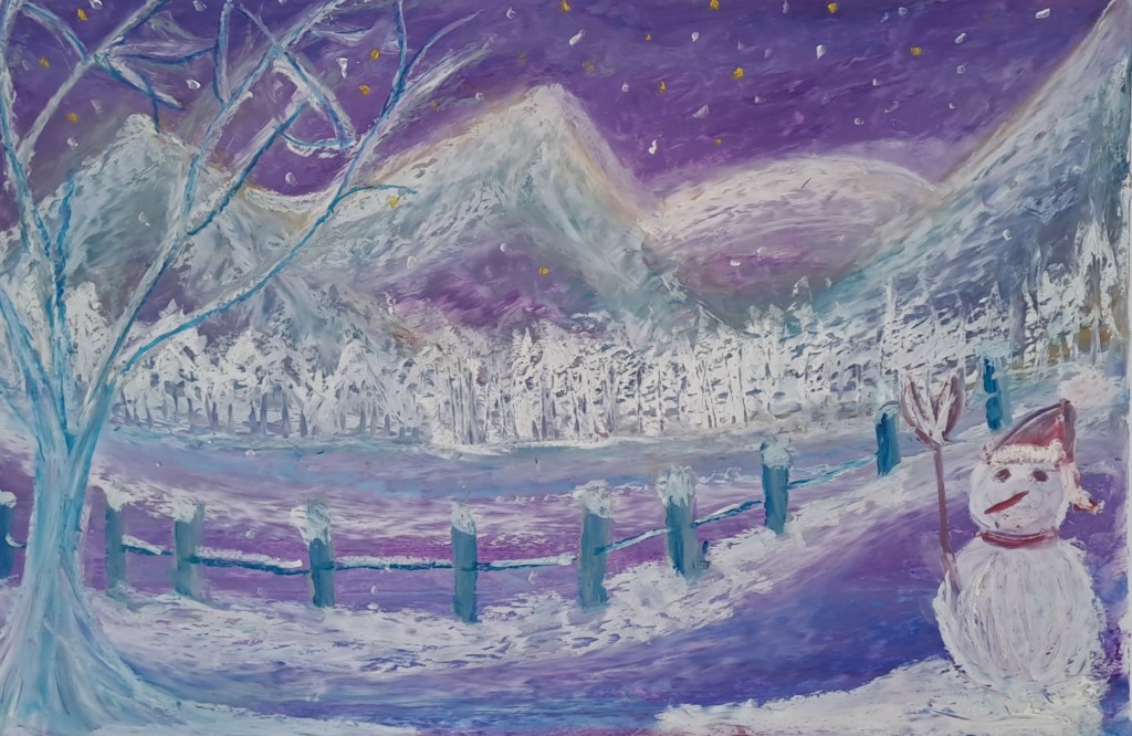 The artist’s expressive use of color transforms the cold scene into something tender and luminous: cool blues and violets harmonize with soft yellows and pinks, suggesting the comforting light of home against the vast quiet of nature.