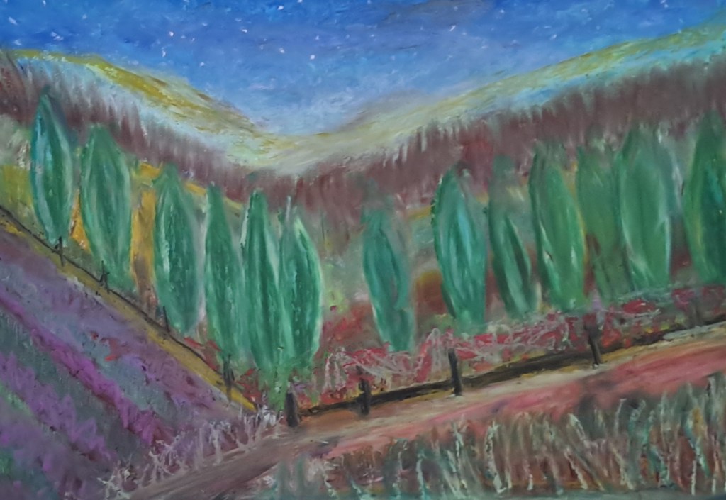 Bernardeschi Nelson’s mastery of oil pastels brings a tactile richness to the composition, enhancing the play of light and shadow across the hills.