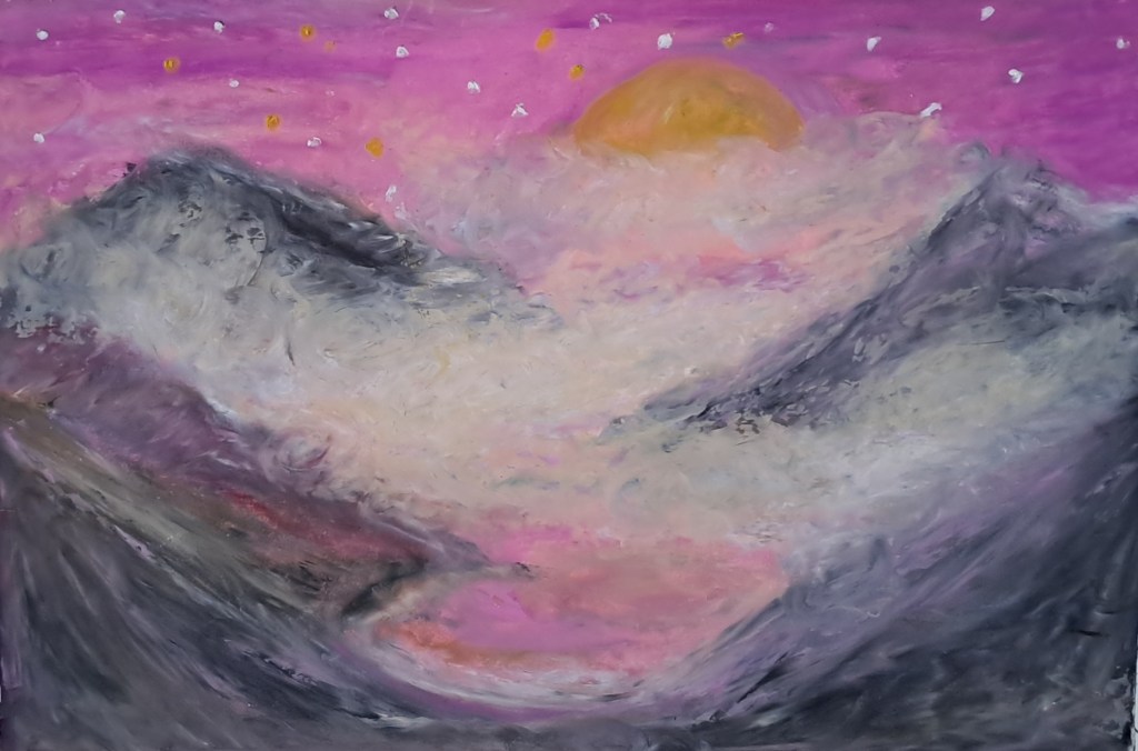 For this piece, I started with a strong gradient sky in shades of pink, magenta, and lavender, building the atmosphere first. Oil pastels were layered gently, then pushed and softened with fingertips, blending starlike dots and bursts of warm golden tones into the upper sky. The rising sun was created with circular, meditative motions, letting the colors glow organically from within rather than layering harsh contrasts.