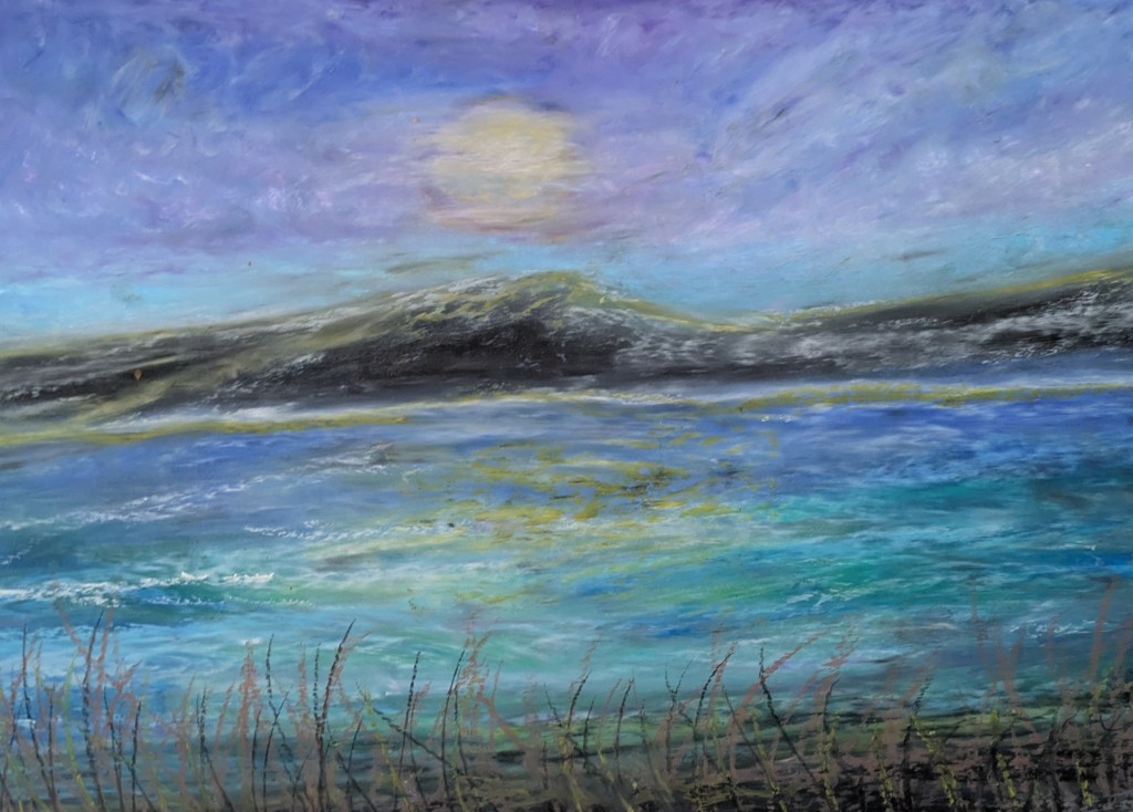 This piece is called Quiet Horizon. It’s an original artwork created with oil pastels on paper, built in soft layers so the sea feels wide and alive without becoming noisy. I wanted the water to carry that blue-green shimmer you only see on cold days, when the shoreline looks almost suspended between sea and sky. The distant land sits low and dark, grounding the scene, while the violet sky keeps it dreamlike.