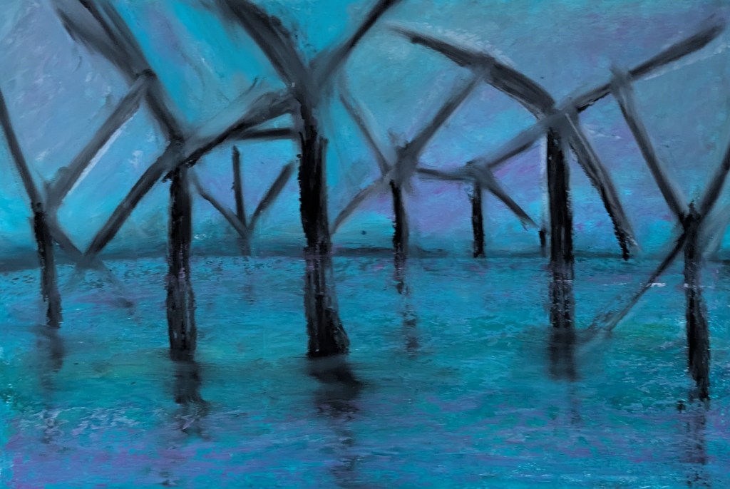 Silent Currents is an oil pastel work by Laura Bernardeschi Nelson that reflects on the quiet presence of clean energy within a coastal environment. Inspired by offshore wind farms, the composition transforms wind turbines into rhythmic, almost calligraphic structures rising from the water, their reflections dissolving gently across the surface below.