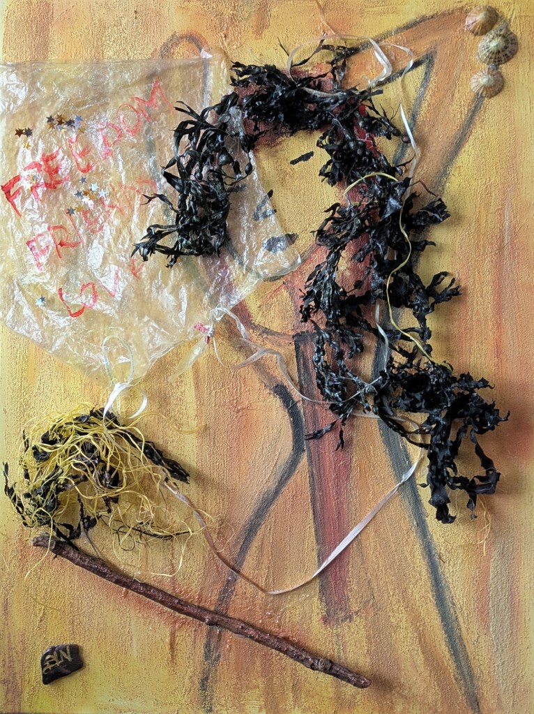 Salt, Skin, and Survival is a mixed media artwork that examines climate change through the physical and symbolic resilience of the female body. Created using acrylic paint, beach sand mixed with gesso and glue, seaweed, and found objects collected along the coast of Northumberland, the work brings together natural materials and human form to express endurance in the face of environmental instability.