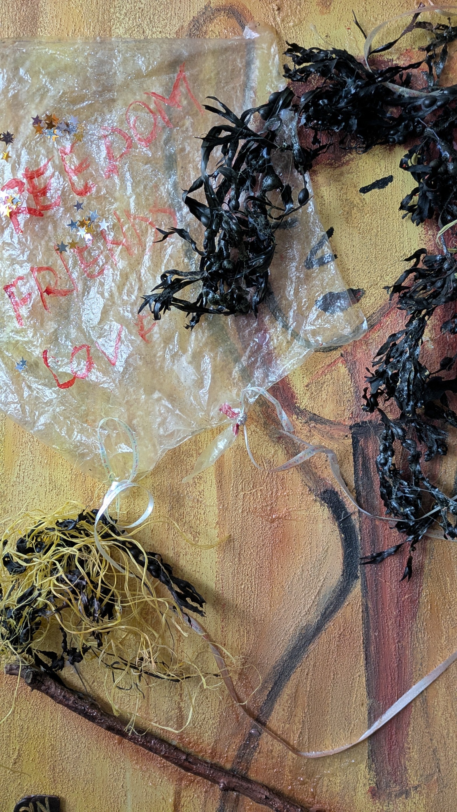 - Medium: Mixed media (acrylic, beach sand, gesso, glue, seaweed, found objects)