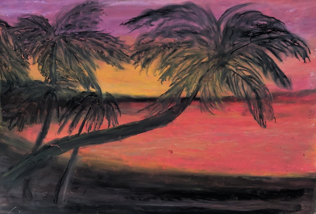 The Evening Does Not Cool is an oil pastel work on paper that explores a landscape suspended in a state of prolonged heat and atmospheric tension. The palm trees, rendered as dark, restless silhouettes, lean and stretch across the surface, suggesting movement shaped by wind, temperature, and time rather than by a fixed sense of place. The scene feels familiar yet unsettled, evoking a landscape that resists rest or relief.