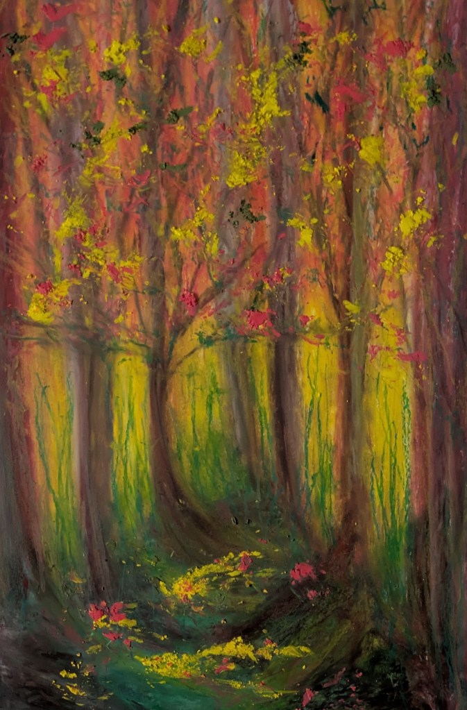 Where Light Falls and Stays is an oil pastel work on paper that explores a woodland interior shaped by colour, depth, and filtered light. Vertical tree forms rise through the composition, their trunks softened and partially dissolved into layers of green, ochre, and deep brown. Flecks of yellow and warm red appear scattered across the surface, suggesting falling leaves, pollen, or fragments of light caught in motion.