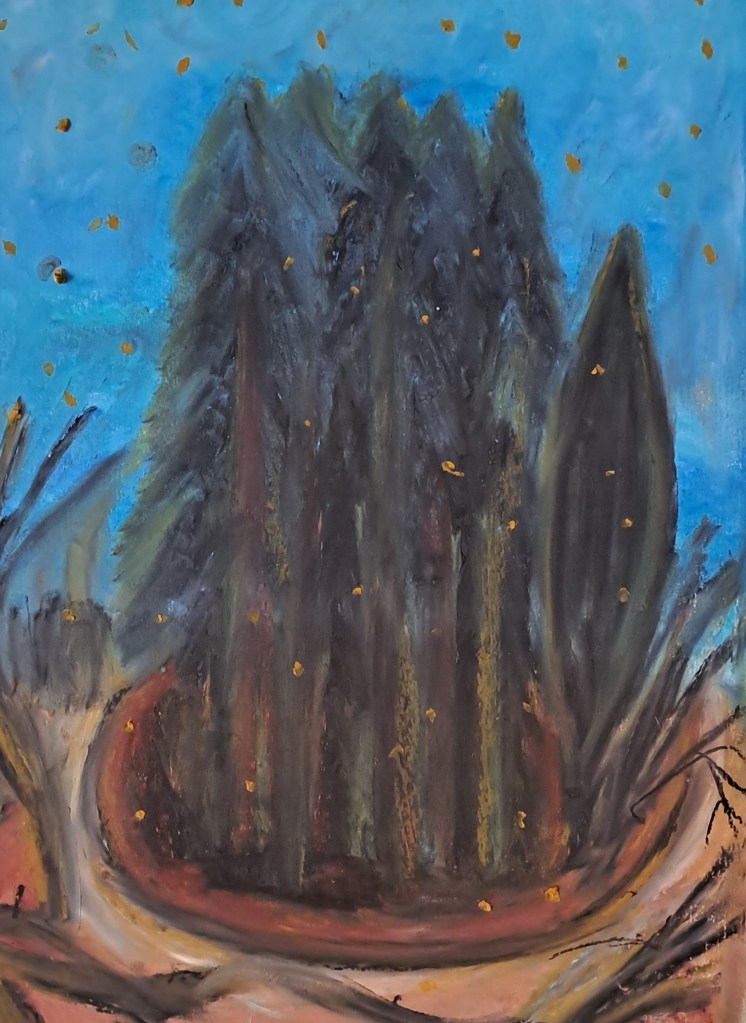 Her style combines bold, expressive colors with a focus on human emotion and nature. Influences are drawn from Renaissance masters like Caravaggio for their dramatic lighting, and modern artists such as Van Gogh, Picasso, and Klimt for their color palettes and emotional depth. Themes such as climate change, personal healing, and resilience are central to her work.