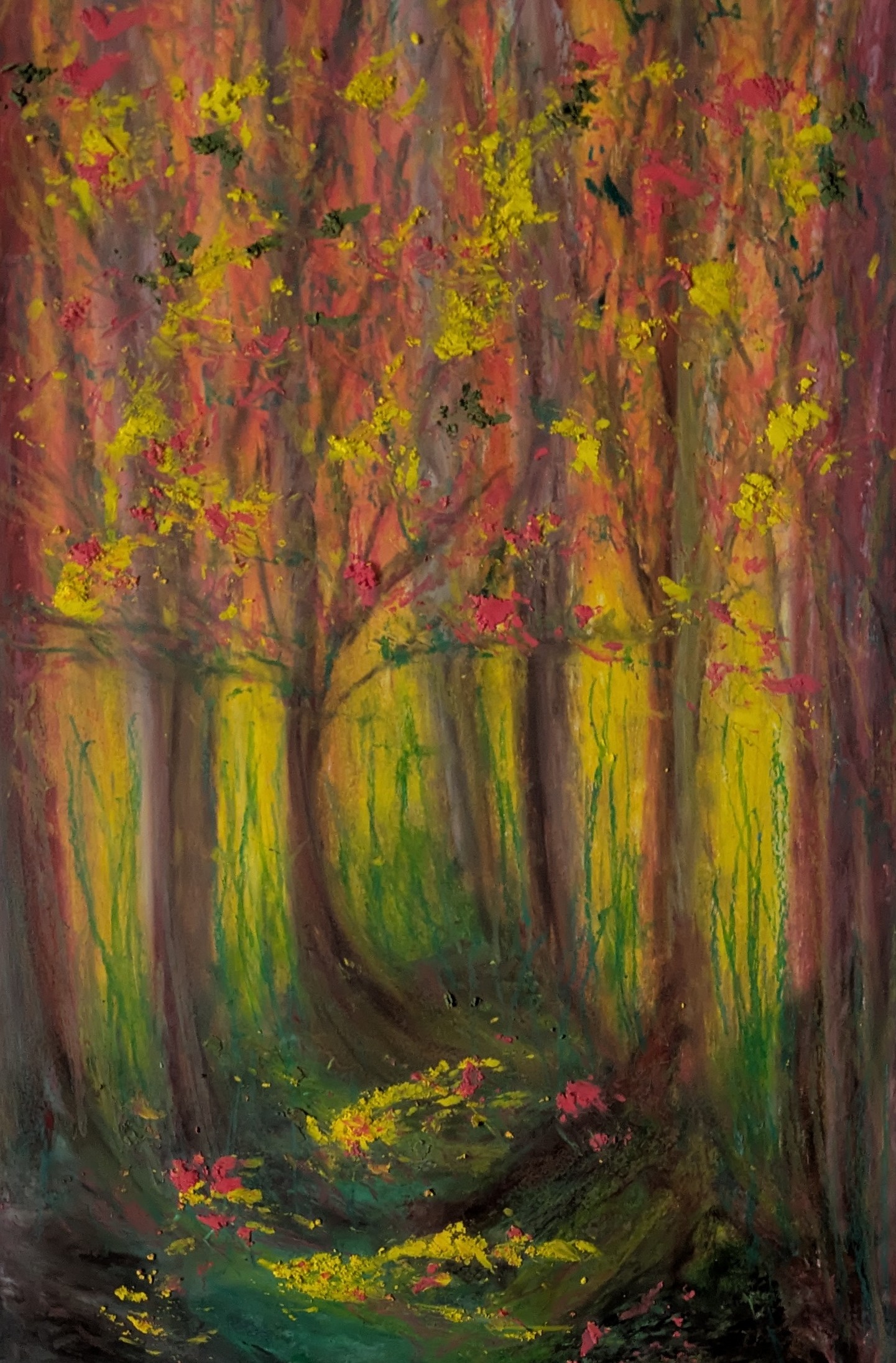 “Where Light Falls and Stays” is a compelling oil pastel artwork by Laura Bernardeschi Nelson, exploring a woodland interior characterized by color and light. The composition features vertical tree forms blended in layers of green, ochre, and deep brown, with splashes of yellow and warm red that hint at falling leaves or sunlight. This piece draws viewers along a curving path, fostering an immersive experience that emphasizes emotional landscapes rather than specific places. The work reflects the interaction of time, movement, and nature, inviting contemplation. It is framed, signed, and includes a certificate of authenticity, with dimensions of 45 × 35 cm.