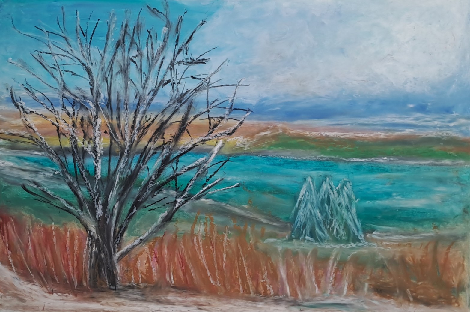 Title: The Calm of Changing Leaves For Sale £290 Description:The Calm of Changing Leaves is a peaceful autumn landscape inspired by the vibrant forests and waterways of Northumberland. Soft, glowing hues of red, gold, green, and turquoise blend together to create a dreamlike atmosphere, inviting the viewer into a space of reflection and serenity. AContinueContinue reading “Winter Calm: Viking Lands in Oil Pastel by Laura Bernardeschi Nelson”